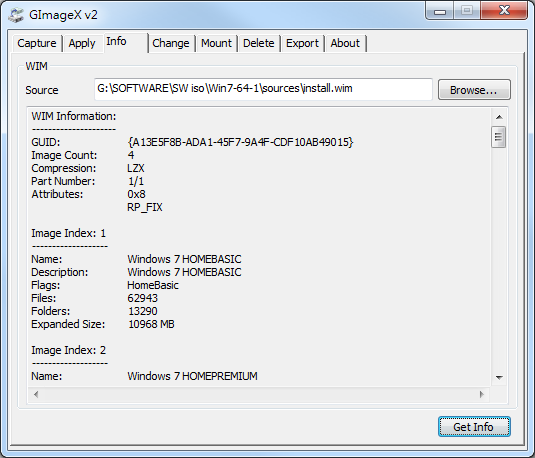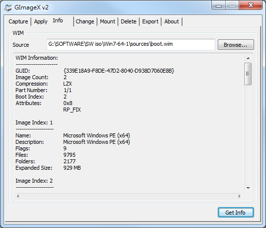 步驟二:執行Gimagex來確認“boot.win”及“install.win”兩個檔案的Image Count,因為不同的Windows7版本的Image Count是不一樣的!